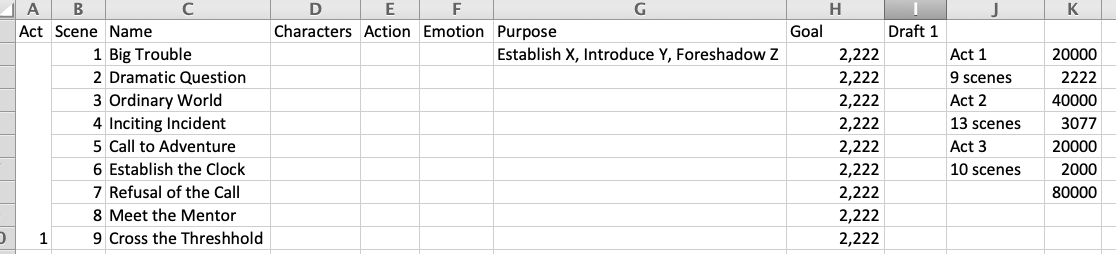 If you’d like to use my spreadsheet layout, here’s an example of Act I, Elements 1-9. I tend to ramble when I write, so I have broken down my word count targets based on an 80,000 word novel. That gives me 25% Act 1, 50% Act 2, and 25% Act 3. These are my rough goals to help me stay on track and should not be taken as carved in stone limits.